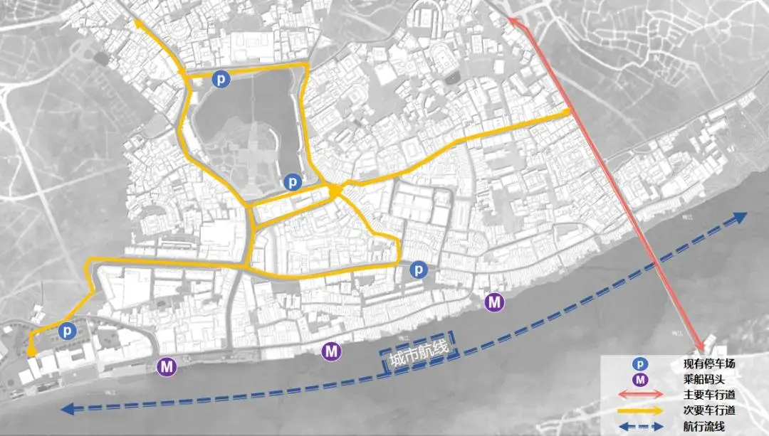 松口古镇规划范围内原有4个停车场。历史镇区及外围的主要车行道、次要车行道以双向交通为主,建设北路等以单向交通为主,内街巷仅供紧急时通行消防车,平时以步行与非机动车交通为主,不通行机动车。除了车行动线以外,为了更好的分流人行动线,建议通过梅江,链接梅江市区与松口古镇码头的航线。