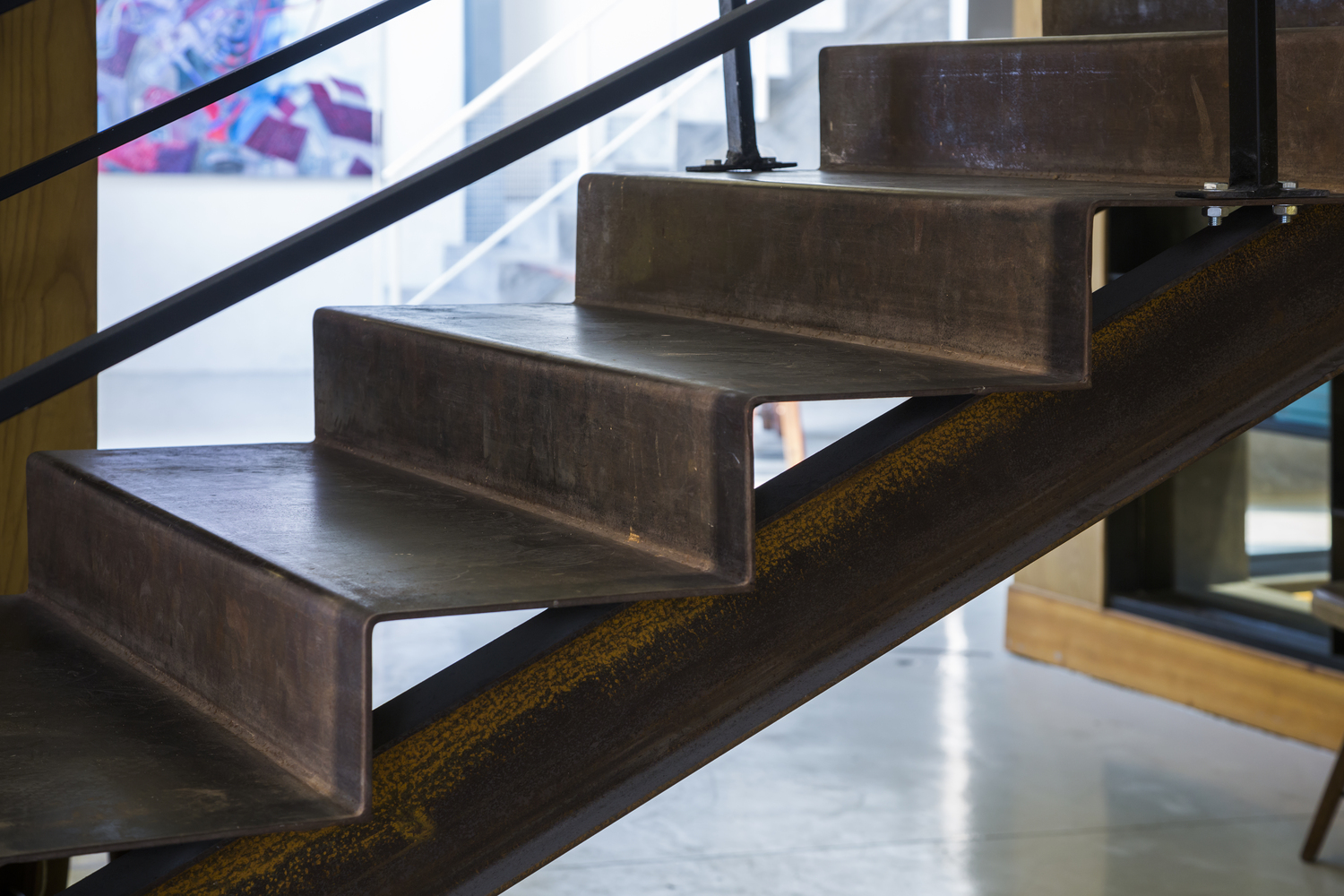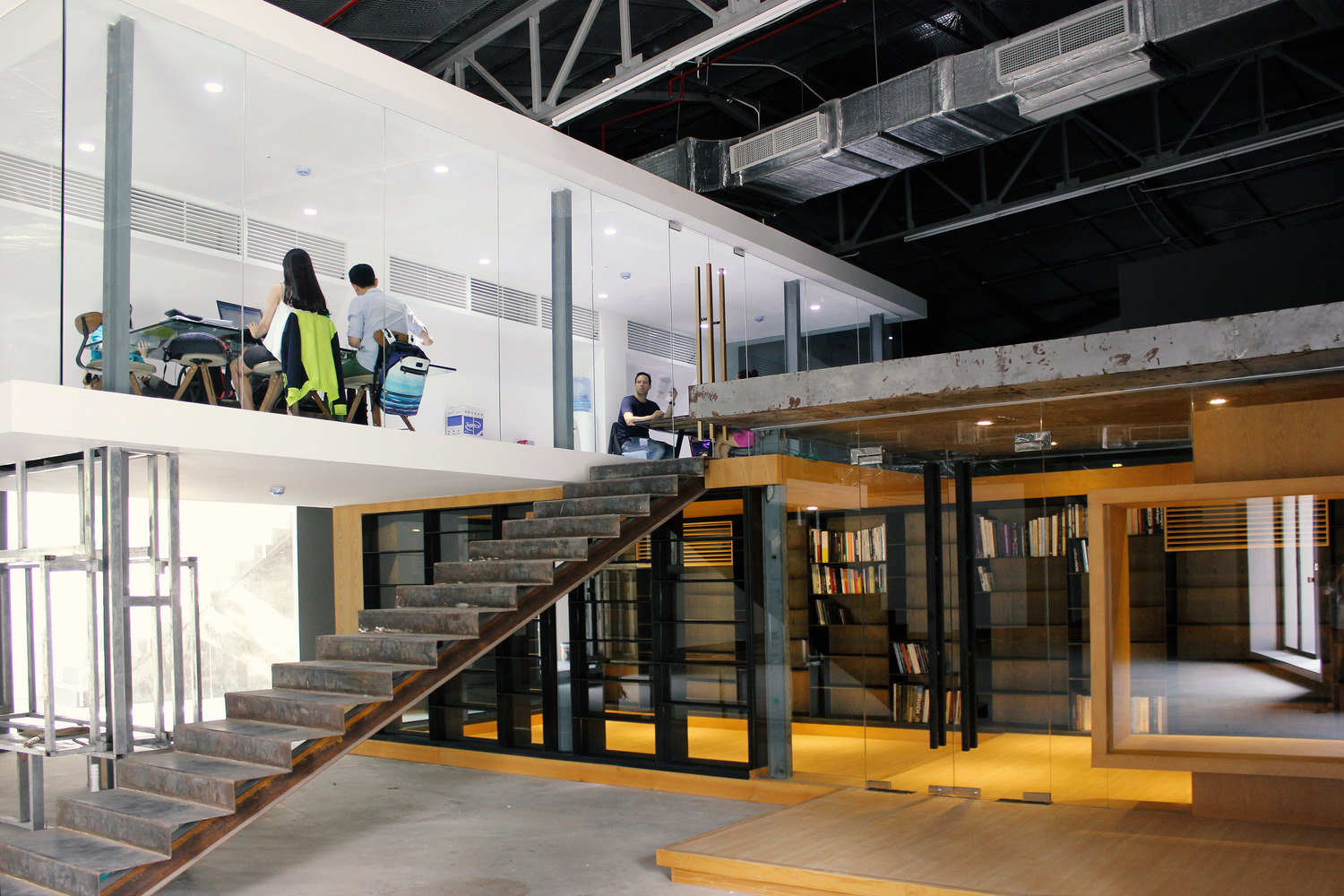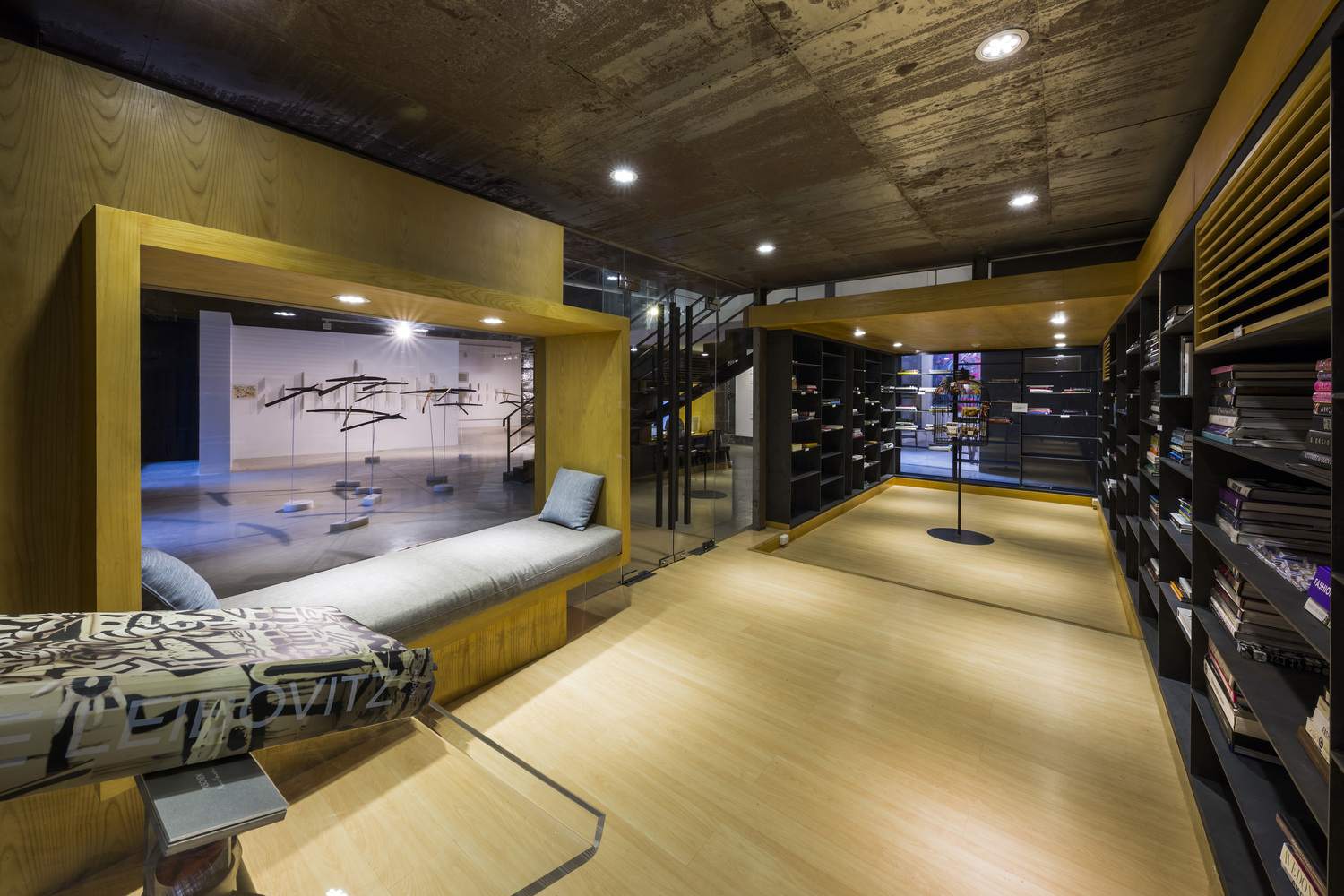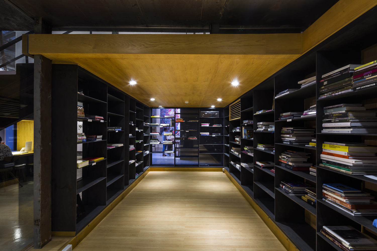 两个的结构体被设计用来围合出空间,经过精心设计,在周围的“剩余”空间中产生多功能画廊。一层的粗钢书架和粗钢屋顶支撑着上方的观景区域。一个木制的窗座可以用来阅读和欣赏上方的艺术品。在阅览室上方,设计了一个玻璃展示空间用来突出特殊的艺术作品。