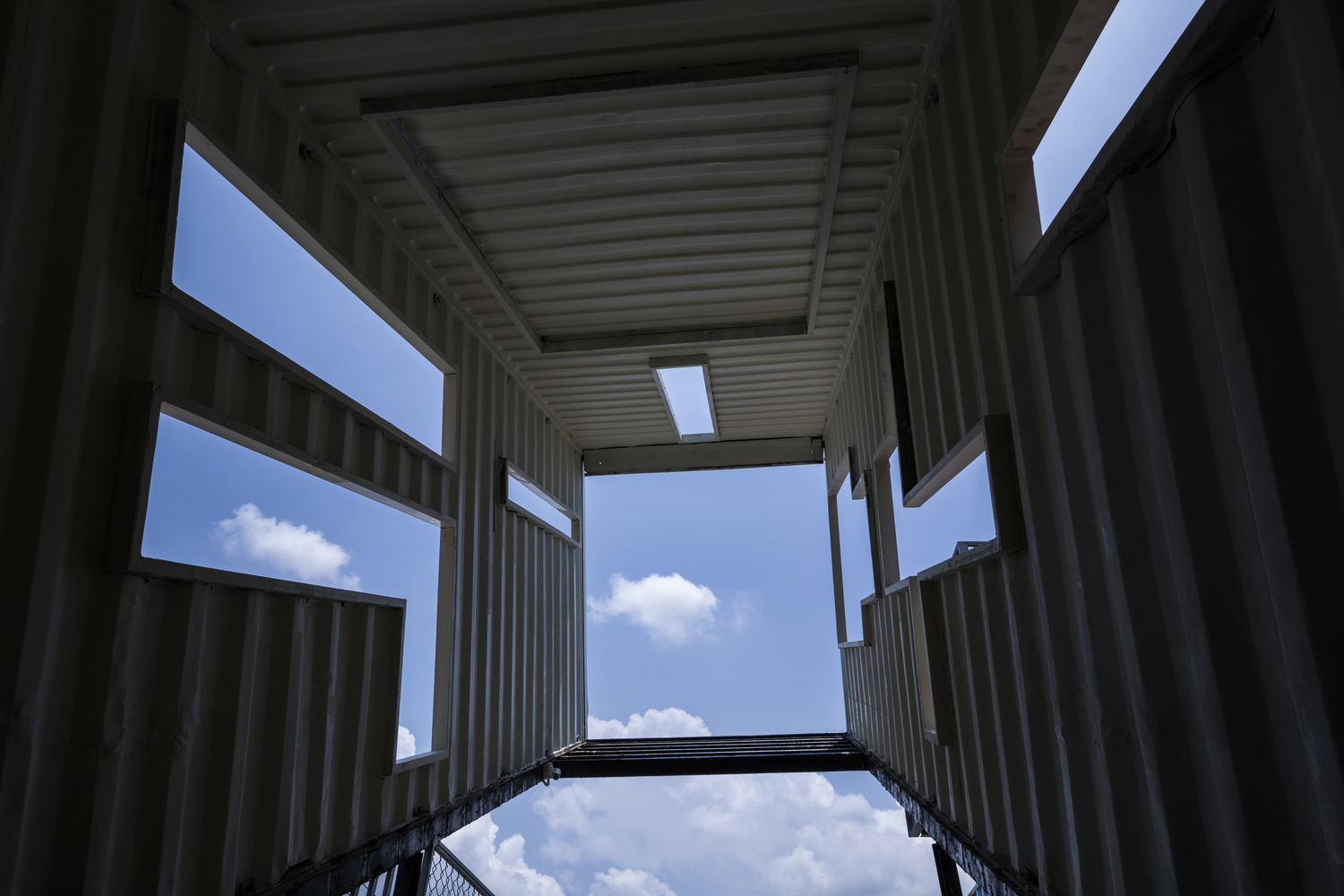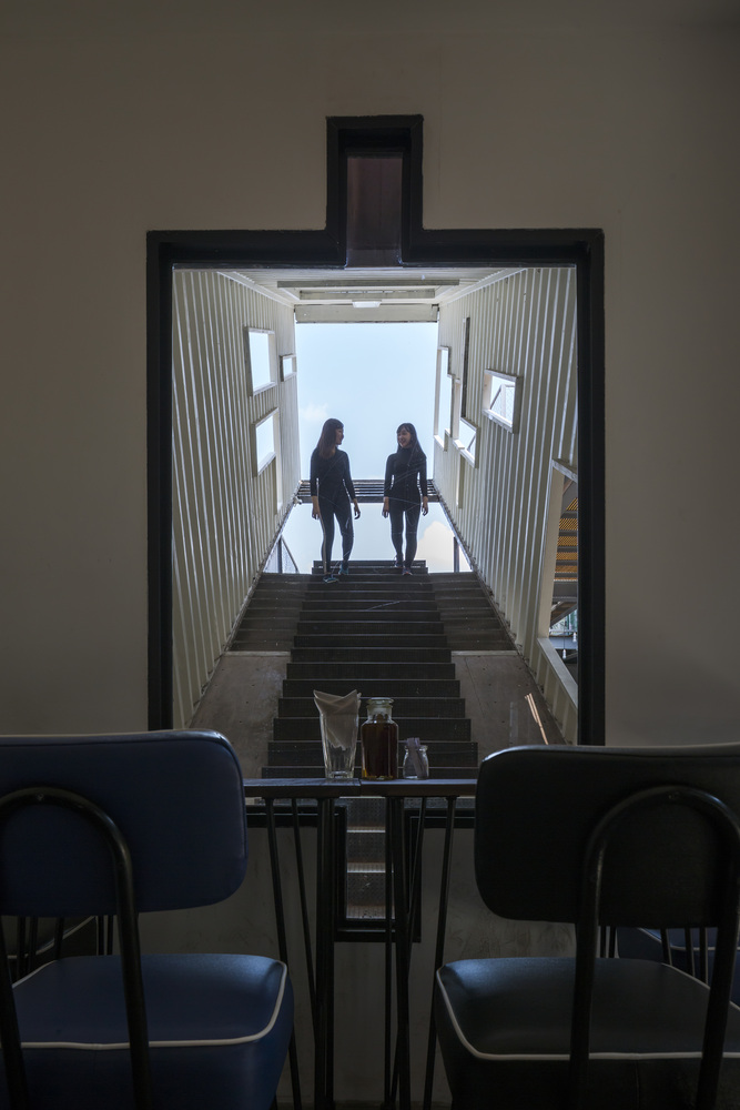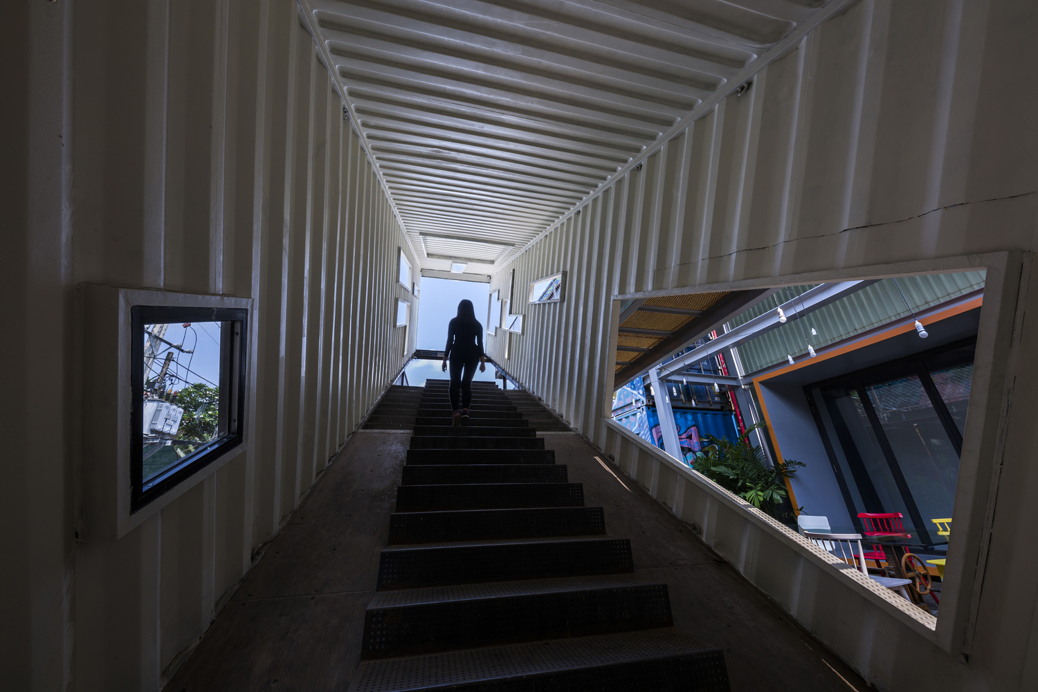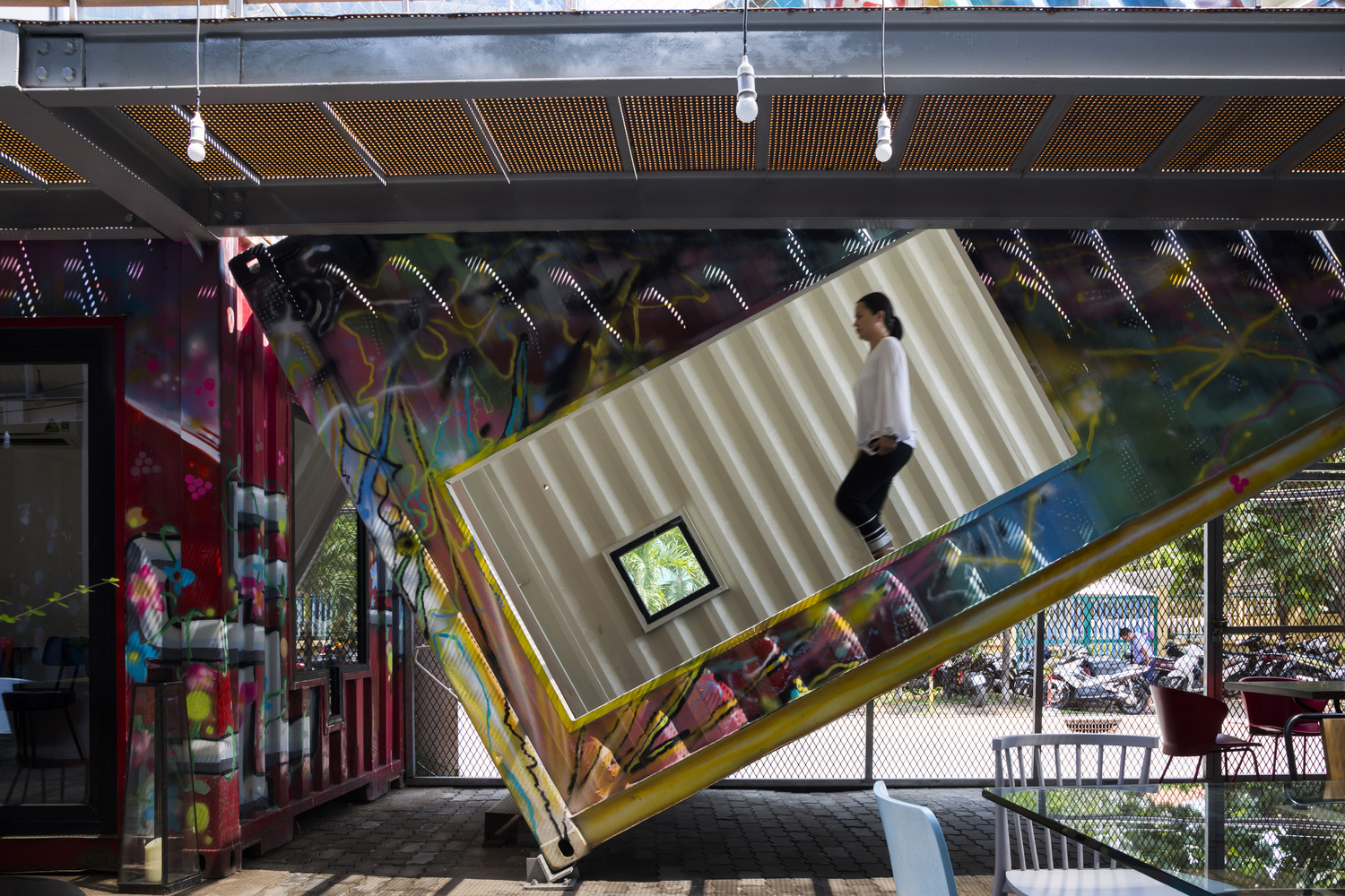 在仓库前面的空地,法律规定只有临时的、可拆卸的的建筑才能建造,所以11个集装箱被堆放在一起,形成了一个松散的三层聚落,其中有咖啡馆、餐厅、商店和工作空间,它们围绕着一个不规则的室外广场。一个长集装箱被以一个不稳定的角度设置,并被不规则地切割出窗口,它容纳了一个楼梯间,以天空的框景作结。它的许多窗口意想不到地连接了邻近的空间,激活了综合体,而它吸引人的角度是这个综合体在周边社区中深入人心。