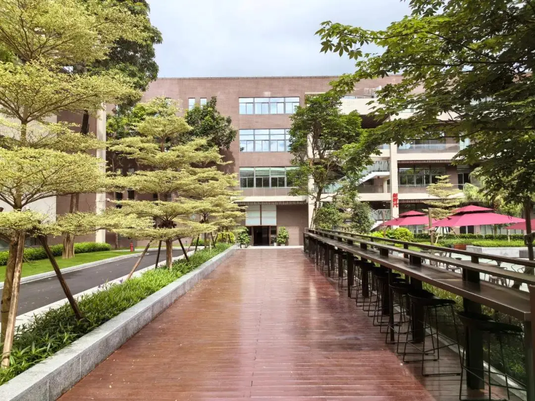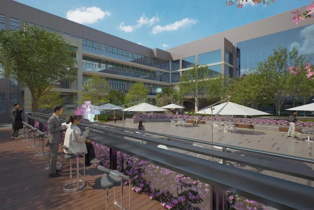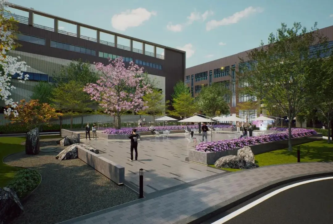 园区绿地种植遵循通透、舒朗的配置原则设计。上层以树形姿态佳的乔木为骨干树种,点缀风铃木等开花点景乔木,灌木层以低维护的观赏草类做基底,不遮挡人行视线。在鲜花盛开的季节,上下班将变成一次值得期待的旅程。