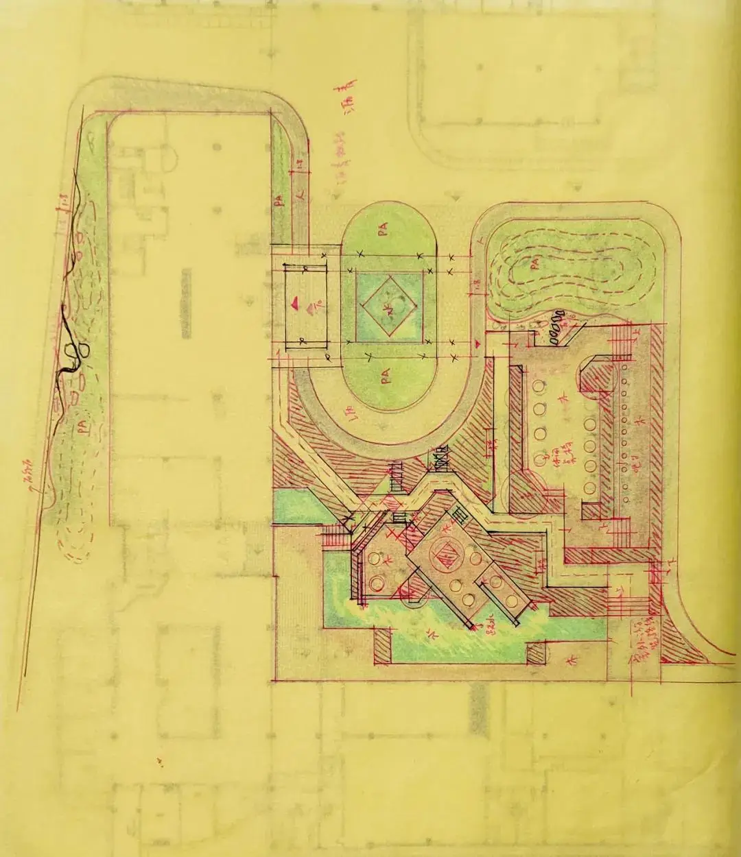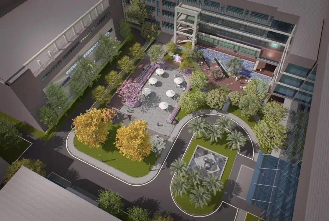 项目为典型的产业园旧改项目。在原始场地中,设计团队将林、池、道等空间记忆点提炼,使其以全新的面貌呈现在新的空间中。疏林理水,铺石植绿,营造雅致园区。
