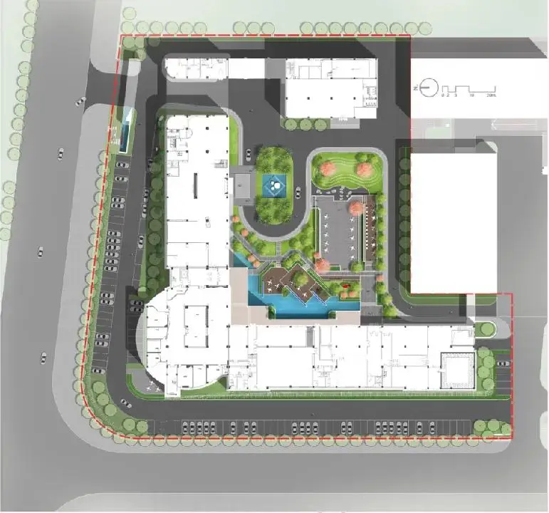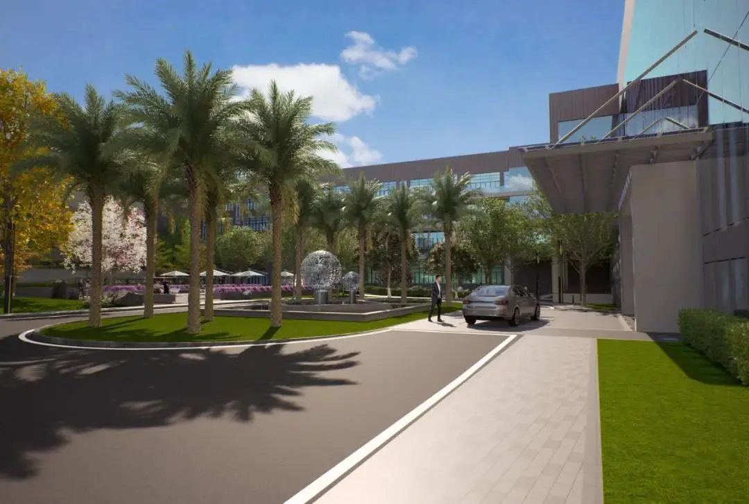 景观设计延续了建筑的布局形态和结构线条,简洁清晰、方向明确,以水、石、木等自然元素的融汇呈现主题氛围,移步异景,邂逅生机。