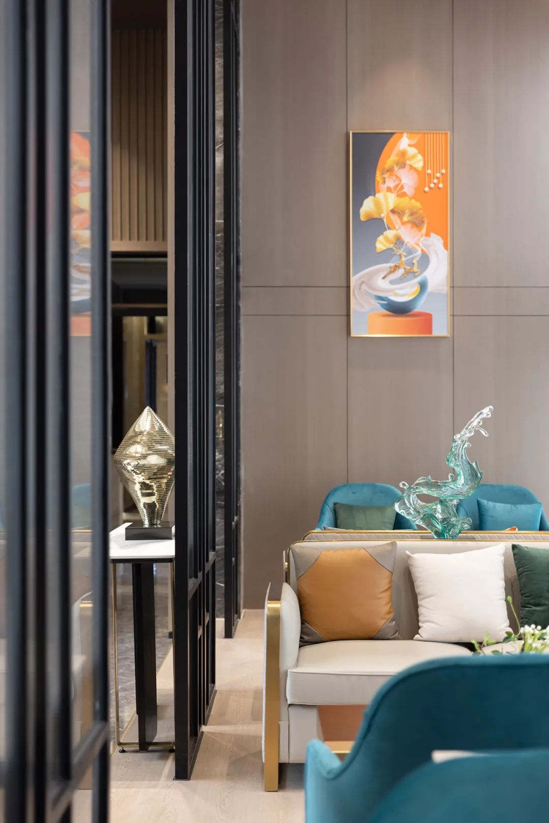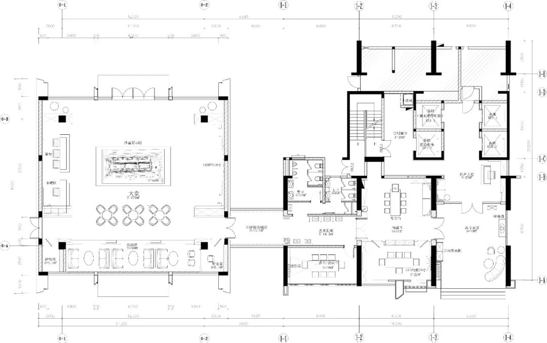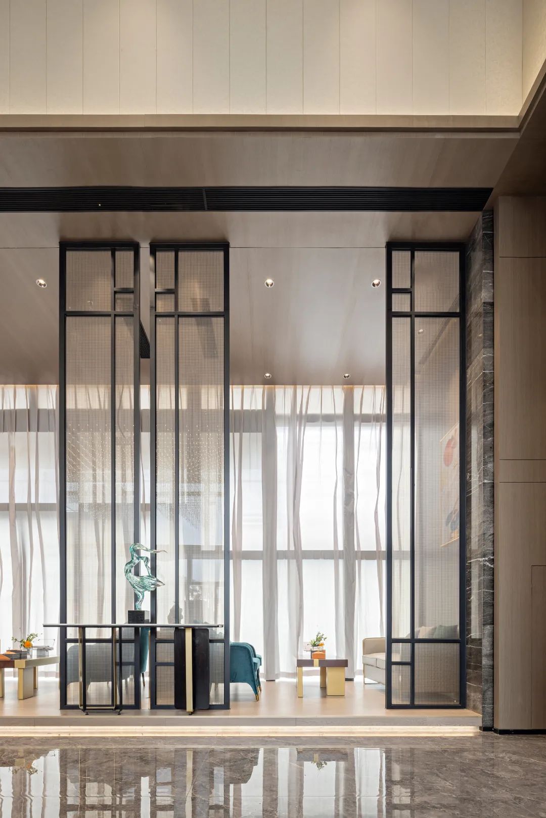 洽谈区增加屏风隔断的形式,隔而不断,在明暗之间,增加空间的形式感和秩序性。