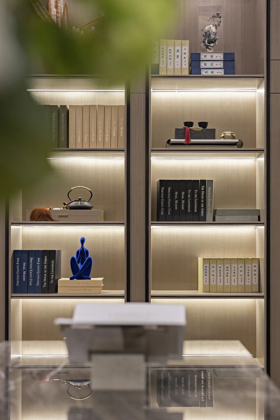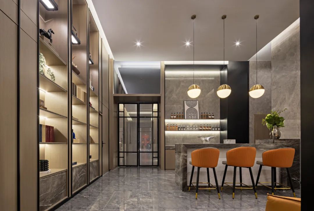 书吧区和茶室中间用书柜形式来分隔,增加两个空间的衔接感,书柜用竖向造型形式来增加空间的现代感及秩序性。
