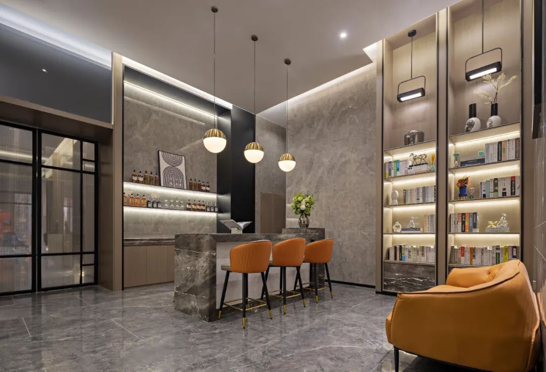 设计师将架空层打造成休闲的城市客厅,通过休闲区、自动售卖机、书吧区、绿植墙等设施的打造来提升居住者的幸福感。柔和的米色、啡色、金属色为主调,营造温暖舒展的空间氛围,凸显低调奢华的气派。