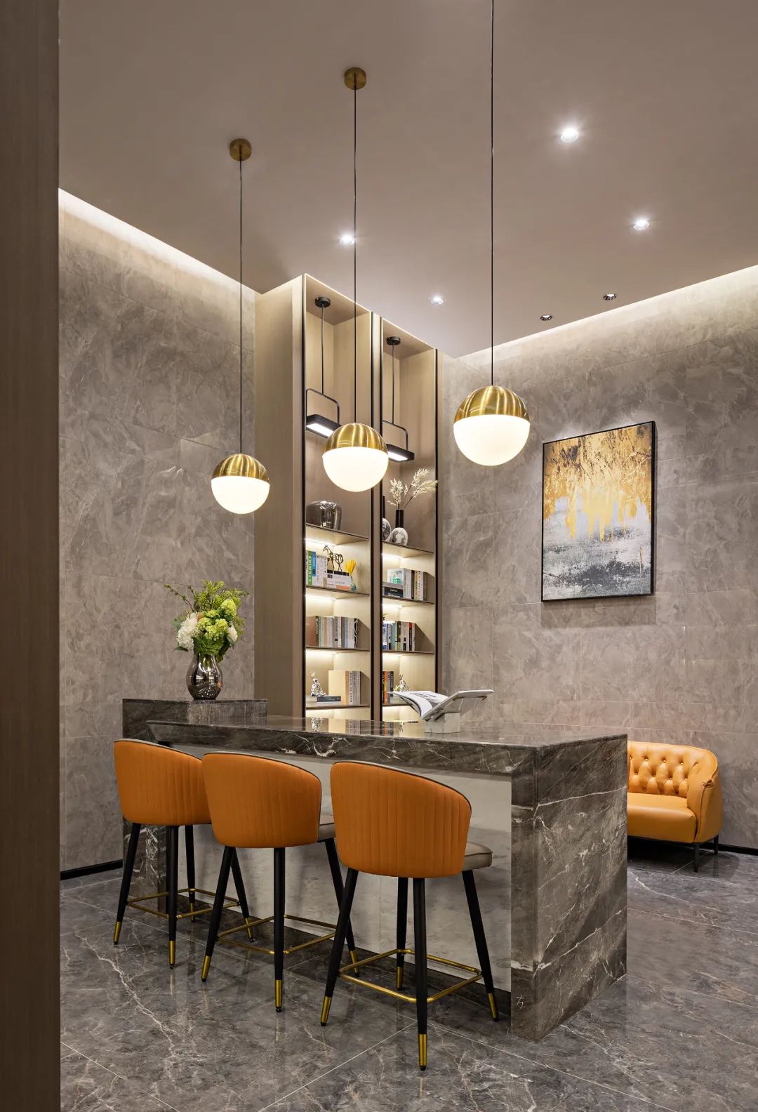巧用售楼部层高,采用双层叠加的方式,让空间更有秩序感和造型感。而石材柱子造型,让空间变得更有气质和力量感。